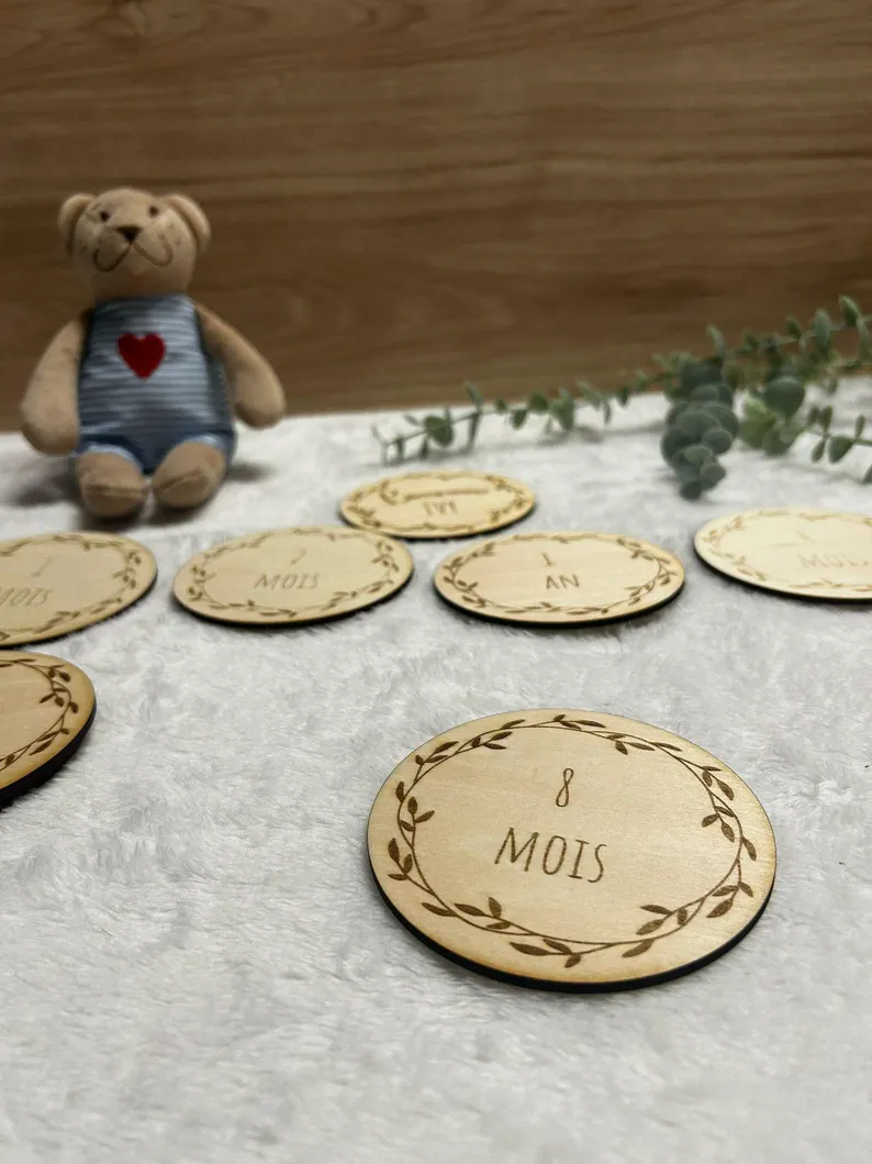 Ce set comprend 12 cartes étapes rondes en bois gravées de 1 mois à 1 an + 1 carte bienvenue personnalisée ou simplement "Bienvenue ♥"