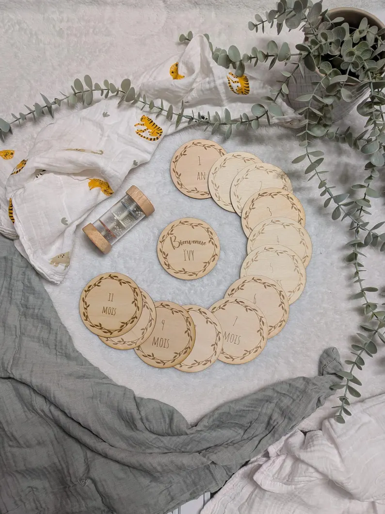 Cartes étapes bébé en bois rondes – 1 à 12 mois + carte bienvenue personnalisée