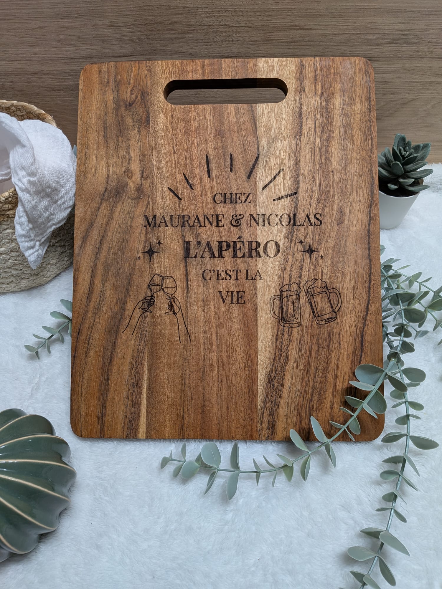 Gravée avec soin dans mon atelier, cette planche en bois massif allie l'utile à l'authentique. Que ce soit pour sublimer vos apéritifs entre amis, préparer vos plus belles recettes ou simplement décorer votre cuisine, elle deviendra vite l'indispensable de vos tablées 🍷✨